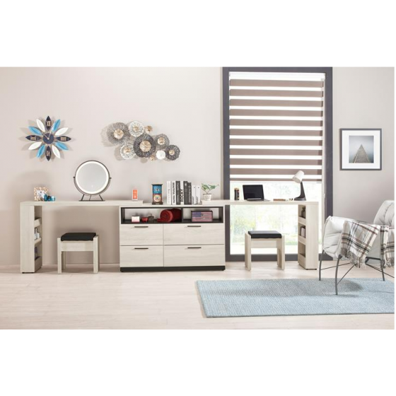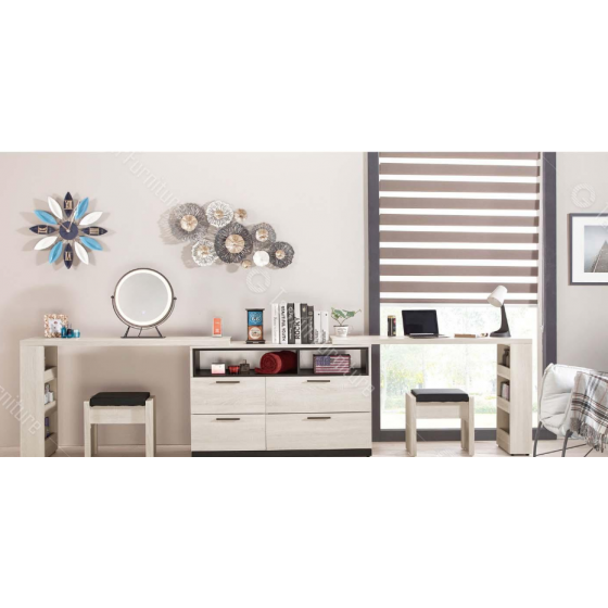 077-2 伊凡卡11.7尺多功能組合鏡台(全組含椅)(雜誌架不分左右方向)$16900 078-4 伊凡卡四抽置物櫃$6800 078-5 拜登桌上鏡(附三段式LED三色調節觸控燈.旋轉式鐵灰色防鏽烤漆鐵框造型)$1700