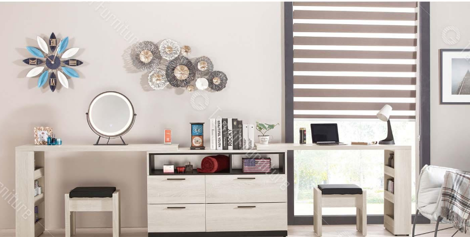 077-2 伊凡卡11.7尺多功能組合鏡台(全組含椅)(雜誌架不分左右方向)$16900 078-4 伊凡卡四抽置物櫃$6800 078-5 拜登桌上鏡(附三段式LED三色調節觸控燈.旋轉式鐵灰色防鏽烤漆鐵框造型)$1700