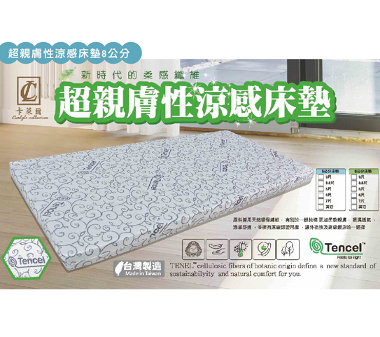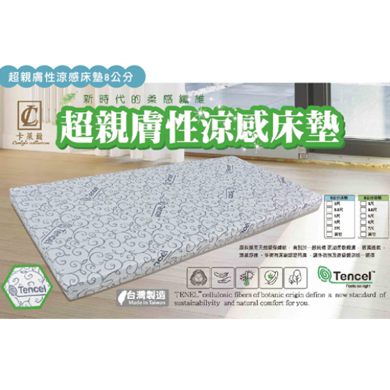 G564-1 超親膚性3尺涼感床墊$1900 G564-2 超親膚性3.5尺涼感床墊 厚度8公分$2240 G564-3 超親膚性5尺涼感床墊 厚度8公分$3190 G564-4 超親膚性6尺涼感床墊 厚度8公分$3800