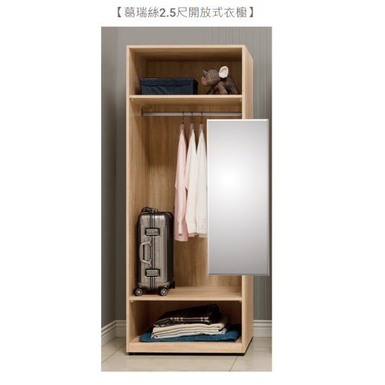 112-5 葛瑞絲2.5尺開放衣櫃(含拉鏡)$7300 112-6 葛瑞絲1.5*6.5尺轉角開放衣櫃$3900 117-3 葛瑞絲2.5尺開放衣櫃(不含伸縮鏡台)$6100 117-4 葛瑞絲1.32尺玄關立鏡$5200