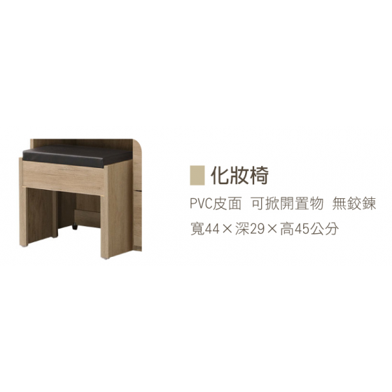 124-3 茉娜2.67尺開門鏡台(含椅)(鏡座高度80.5公分.鏡框打開內附1片固定隔板可置物)$7000 124-4 茉娜化妝椅(PVC皮面)(可掀開置物.無絞鍊)$800