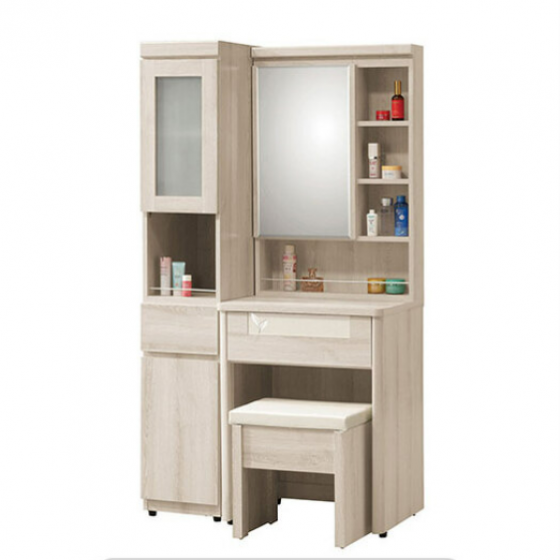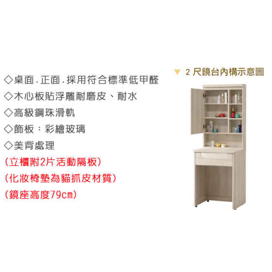 065-3 維娜3尺開門鏡台(含椅)(鏡座高度76公分.恕不拆賣.化妝椅墊為貓抓皮材質)$9200 066-8 維娜3尺組合鏡台(全組)(附2片活動隔板.化粧椅墊為貓抓皮材質)$10400 066-9 維娜2尺開門鏡台(含椅)(鏡座高度79公分.恕不拆賣.化粧椅墊為貓抓皮材質)$5900