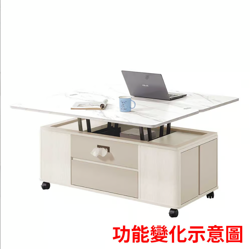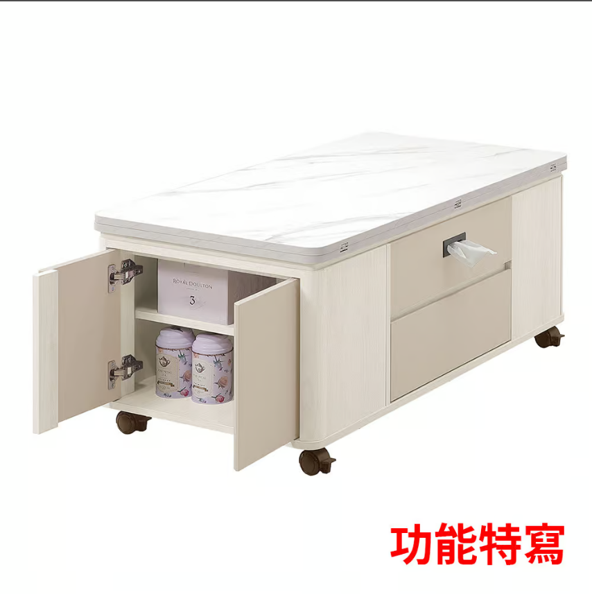 536-2 蕾佳娜4尺升降茶几 (面板為仿大理石紋美耐皿耐磨塗裝) (油壓緩衝升降五金.附6顆可固定輪) (兩面單抽皆可開.左右門內各附1片活動隔板)$10600