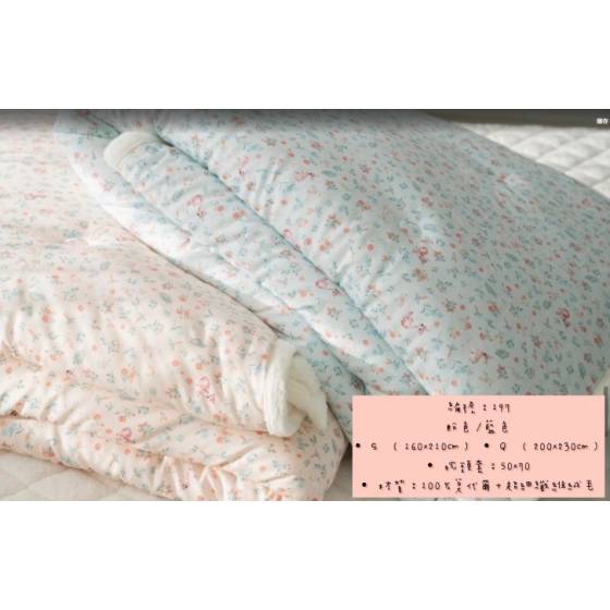 編號:197韓國棉被 顏色:粉/藍色 尺寸:S160*210 Q:200*230公分 枕頭套:50*70公分 材質:100%莫代爾+超細纖維絨毛