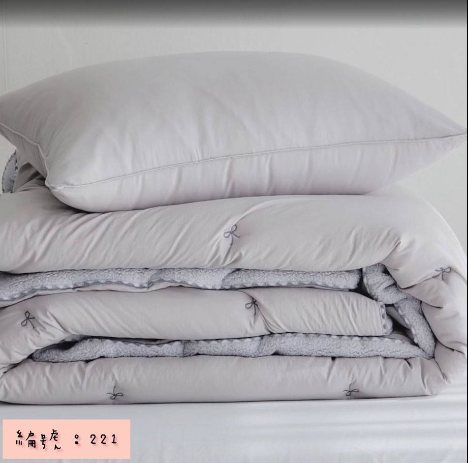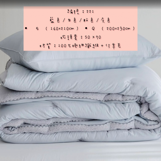 編號221 韓國棉被 顏色:藍/白/粉/灰色 尺寸S:160*210公分 Q:200*230公分 枕頭套50*70公分 材質:100%極細纖維+仿羊毛
