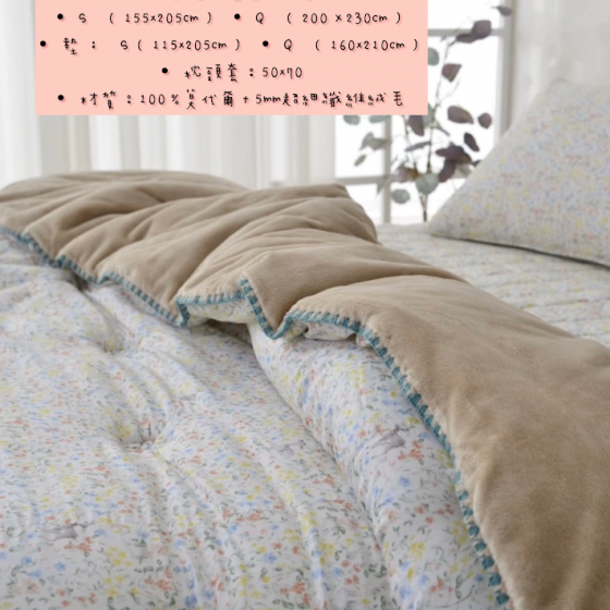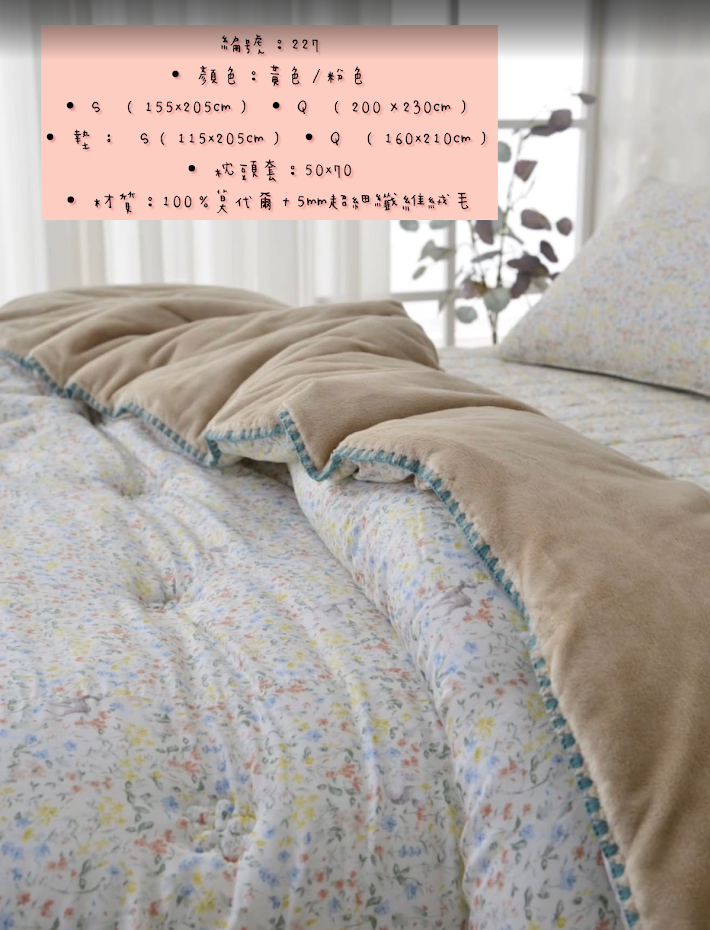 編號:227韓國棉被 顏色:黃/粉色 尺寸:155*205公分 Q:200*230公分 墊子:S115*210公分 Q:160*210公分 枕頭套:50*70公分 材質:100%莫代爾+5MM超細纖維絨毛