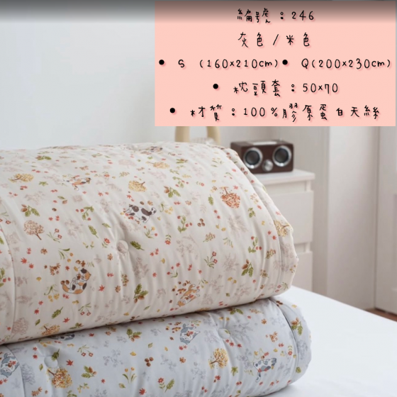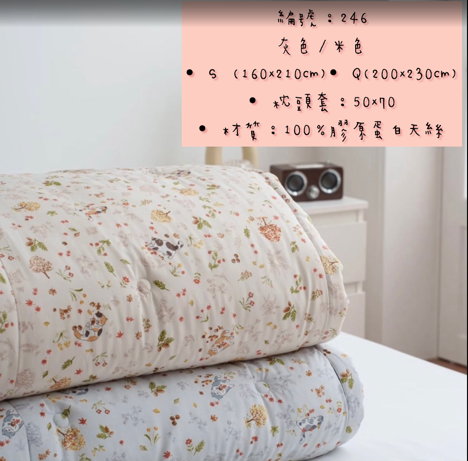 編號:246韓國被 顏色:灰/米 尺寸S:160*210公分 Q:200*230公分 枕頭套:50/70公分 材質:100%膠原蛋白天絲