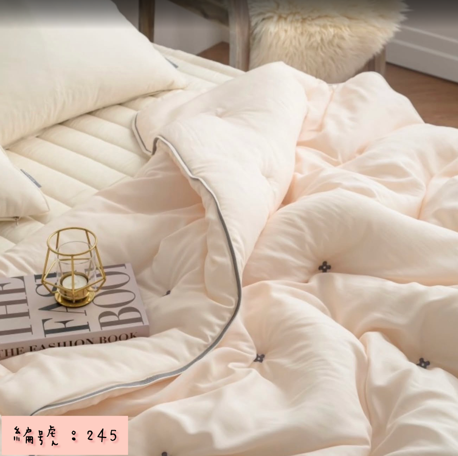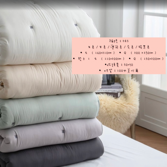 編號:245韓國被 顏色:白/米/薄荷/灰/炭黑色 S:160*210公分 Q:200*230公分 墊子S:110*200公分 Q:150*200公分 枕頭套:50*70公分 材質:100%莫代爾