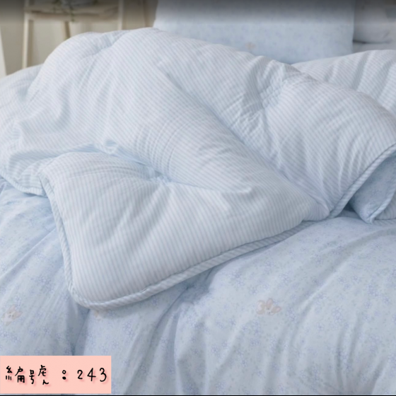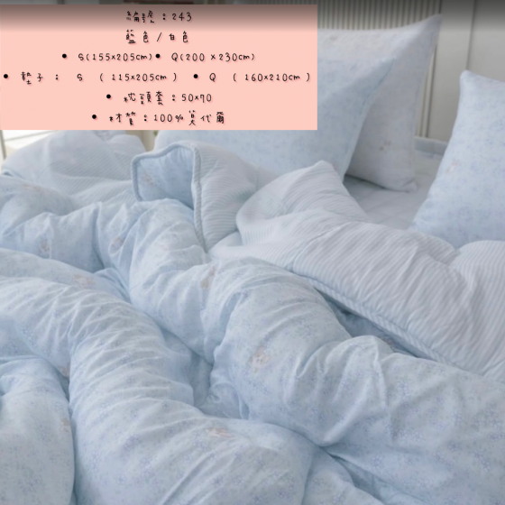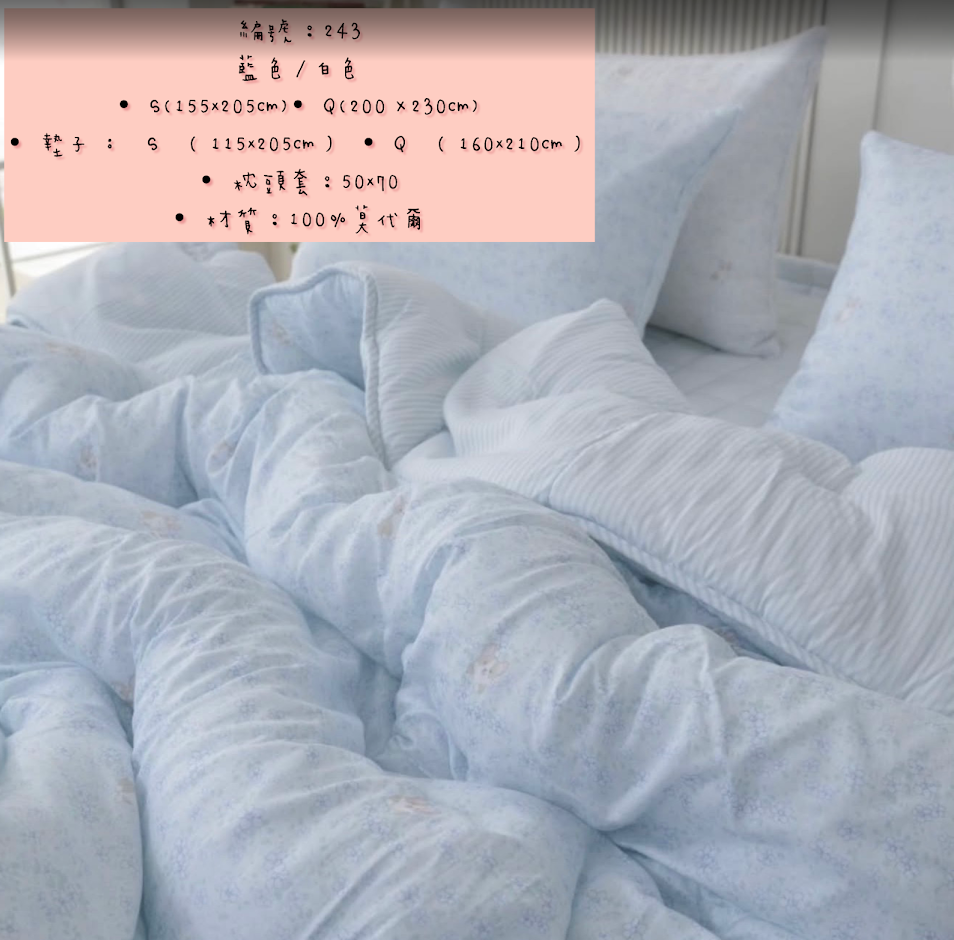 編號:243韓國被 顏色藍/白色 S:155*205公分 Q:200*230公分 墊子:S:115*205公分 Q:160*210公分 枕頭套50*70公分 材質:100%莫代爾