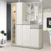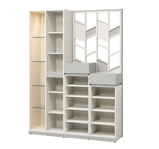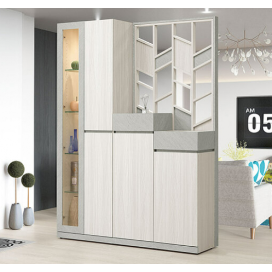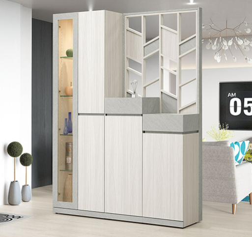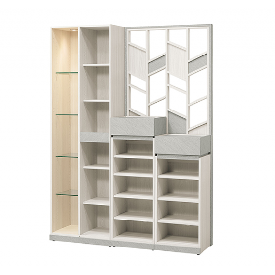631-2 黛拉4.65*6.5尺玄關組合鞋櫃 全組 ⊙展示櫃附4片8mm玻璃隔板、 ⊙4片活動木隔板、 ⊙附按鍵式黃光投射燈具、 ⊙門片採用3mm強化玻璃、 ⊙屏風櫃附7片活動隔板+2個透氣孔、$23000