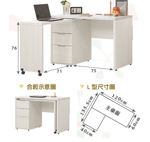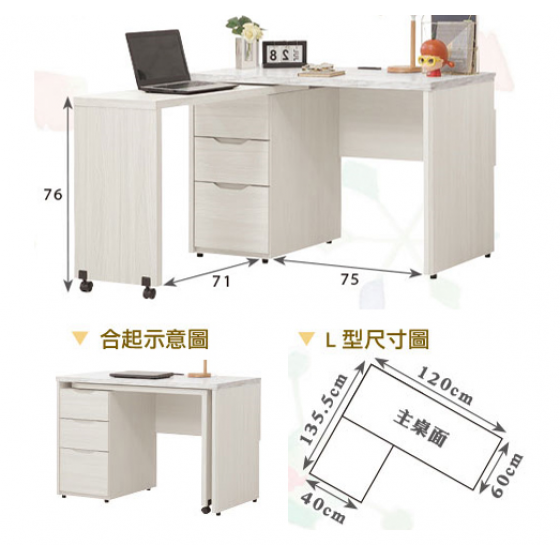 712-4 蓁妮4尺旋轉書桌 往左開 ⊙附1個2孔2插座、 ⊙仿大理石紋美耐皿桌面$8700