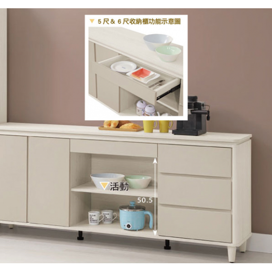 830-3 蕾佳娜5尺餐櫃 ⊙採斜邊手把設計、 ⊙開門內附1片活動隔板$9300