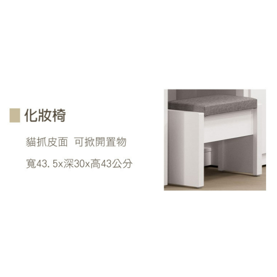 151-2 蜜雪兒2尺開門鏡台(含椅)(鏡座高度76.5公分)$6400 151-3 蜜雪兒化粧椅(貓抓皮面)(可掀開置物)$1000 151-4 蜜雪兒 1.32尺鏡台立 內抽附鎖頭*1 附*3活動隔板 門片內附貼鏡 $5300