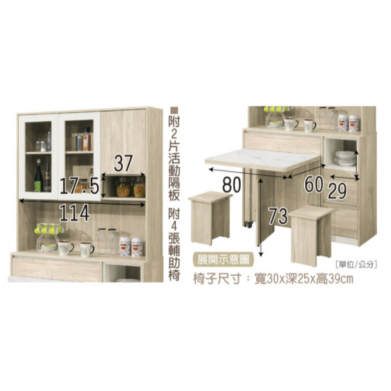 520-2艾琳4尺餐桌式石面餐桌(上+下)(附2片活動隔板.附4張輔助椅椅子尺寸:寬30*深25*高39公分)$21000 520-3艾琳4尺餐桌式石面餐櫃下座(附4張輔助椅椅子尺寸:寬30*深25*高39公分)$15800 520-4艾琳4尺餐桌式岩板餐櫃(上+下)( 附2片活動隔板 附4張輔助椅椅子尺寸:寬30*深25*高39公分 )$20800