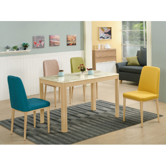 874-2 坦菲橡木色4尺石面餐桌$3800 594-8 坦菲藍色皮餐椅(坐深43坐高47公分)$1200