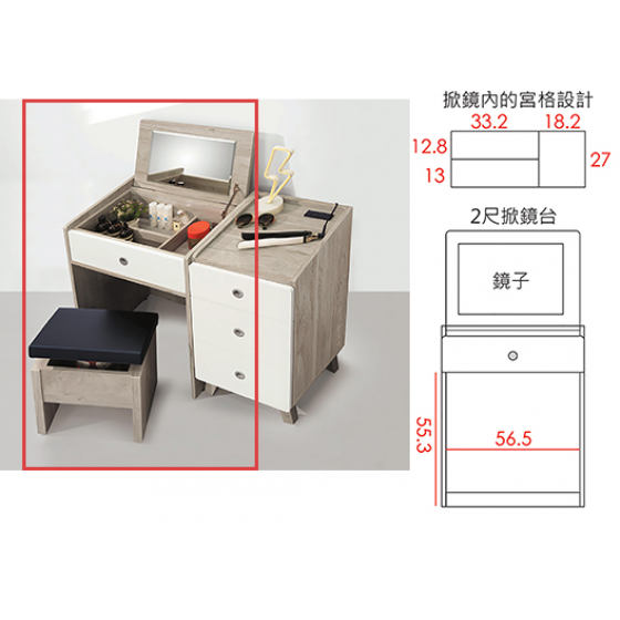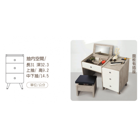 C053-7 溫蒂2尺掀鏡台(含椅)$4900 C053-8 溫蒂三抽功能櫃(附插座)$3600