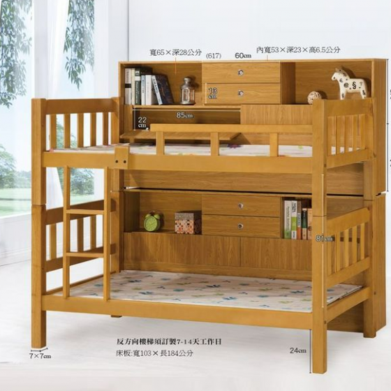C145-1 白木方柱3.5尺雙層床(全組 615-617*2 含邊櫃*2)$24000 C145-2白木方柱3.5尺雙層床(不含邊櫃)$12000 C145-3 赤陽色床邊櫃(單只 全木心板貼赤陽色玻麗漆)$6100
