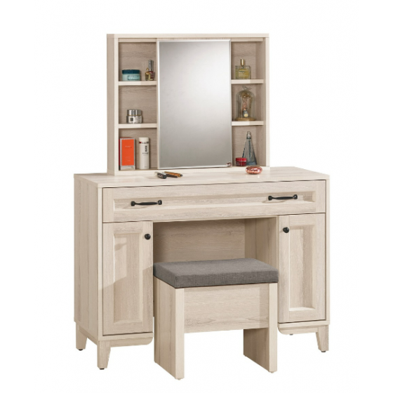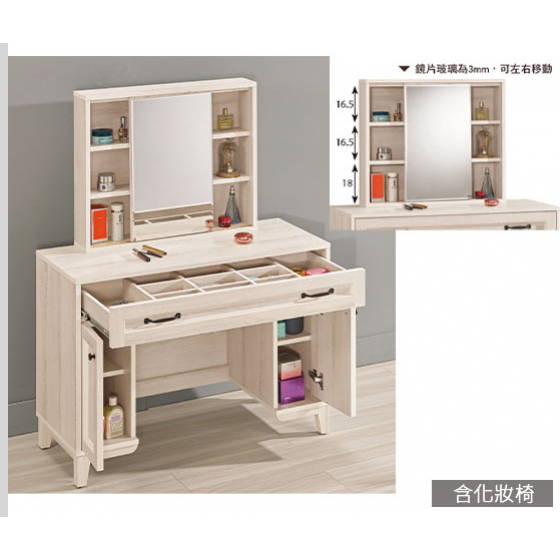 A1141-3 雪莉3.3尺化妝台 全組 含椅 附活動隔板2片 $11400 A1145-2 雪莉2尺化妝台 全組 含椅 附活動隔板2片$7900