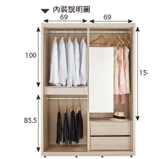 A1152-1優娜7尺拉門衣櫥 附內鏡 $30800 A1152-2 優娜5尺拉門衣櫥 附內鏡 $24900 A1152-3 優娜1.5尺開放置物衣櫥 可左右擺放 $6600