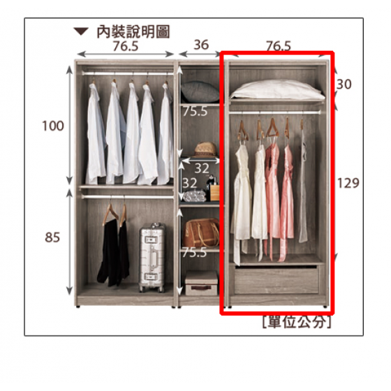 A1241-2 費納2.7尺衣櫥 雙吊 $9600 B165-3 費納2.7尺衣櫥 單吊$10100 A1241-4費納1.3尺衣櫥 附活動隔板2片 $8200
