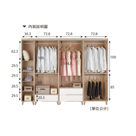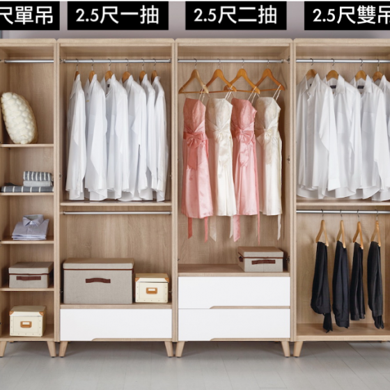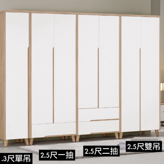 A1255-1 伯妮斯2.5尺衣櫥 雙吊 $12300 A1255-2伯妮斯2.5尺衣櫥 二抽$13200 A1255-3伯妮斯2.5尺衣櫥 一抽 $12900 A1255-4伯妮斯1.3尺衣櫥 單吊 附活動隔板3片 $8800