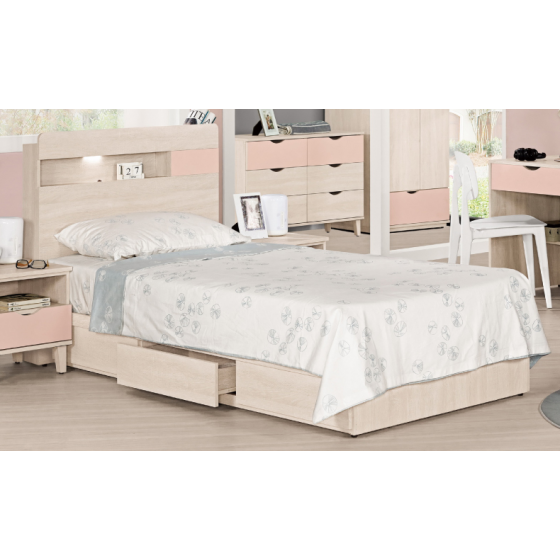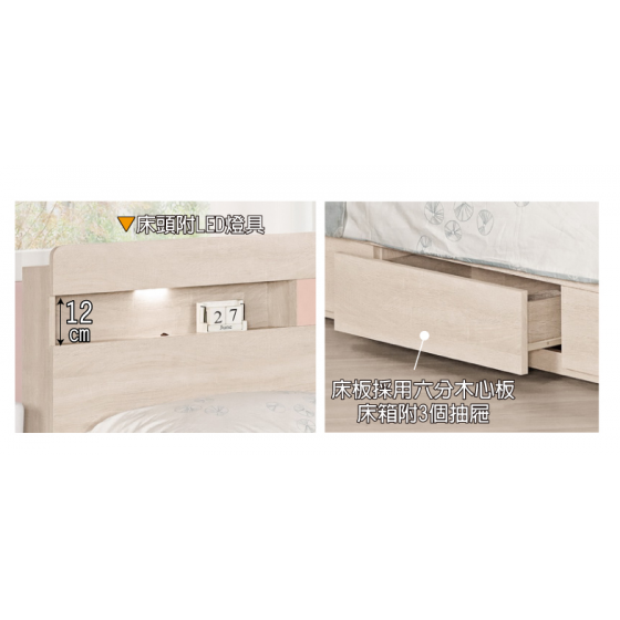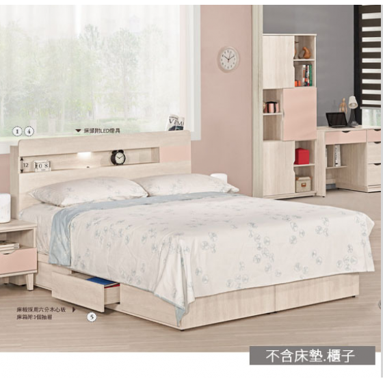 A1265-1 芬娜5尺雙人床 不含床墊 單邊抽屜 含LED燈具$14300 A1267-1芬娜3.5尺單人床 不含床墊 單邊抽屜 含LED燈具$11100 A1299-6芬娜5尺床頭片 含LED燈具$4800 A1299-7芬娜3.5尺床頭片 含LED燈具$4200