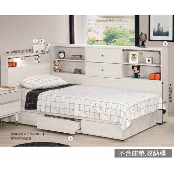 A1282-2 蘿克斯3.5尺單人床 不含床墊 單邊抽屜 附LED燈具$11100