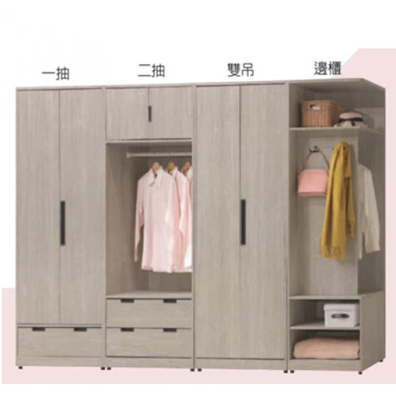 F188-4布來恩淺灰橡2.3尺組合式開門衣櫥$6000 F188-5 布來恩淺灰橡2.3尺組合式二抽半開放開門衣櫥$6300 F188-6布來恩淺灰橡2.3尺組合式一抽開門衣櫃 內活動隔板一片$6400 F188-7 布來恩淺灰橡2.3尺被櫃$2100