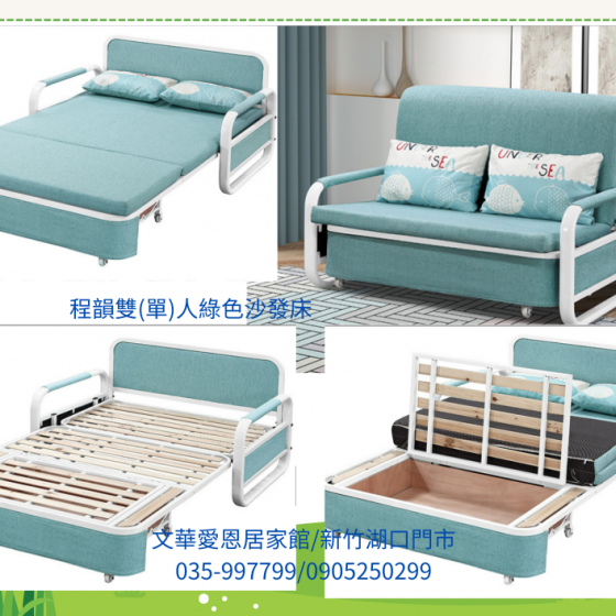 203-2程韻雙人綠色沙發床(坐寬117.5坐深58坐高40公分附2個小抱枕附有儲物箱)$11800 203-3程韻單人綠色沙發床(坐寬97坐深58坐高40公分附2個小抱枕無附儲物箱)$9200