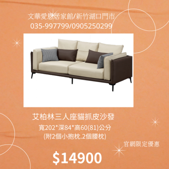 229-5 艾柏林三人座貓抓皮沙發(坐寬155量至背枕處坐深59坐高42公分附2個小抱枕.2個腰枕)$15800