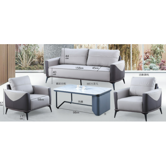C199-4 T93沙發1+1+3 (灰+咖啡皮)$17200 C199-5 T93沙發一人座(灰+咖啡皮)$4300 C199-6 T93沙發三人椅沙發(灰+咖啡皮)$8600 C254-15 885大茶几$2800