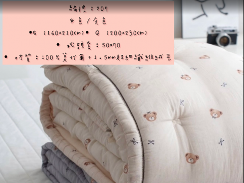 編號:207韓國棉被 顏色:米/灰色 尺寸:160*210公分 Q:200*230公分 枕頭套:50*70公分 材質:100%莫代爾+1.5MM超細纖維絨毛