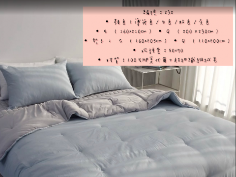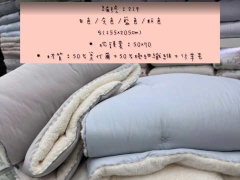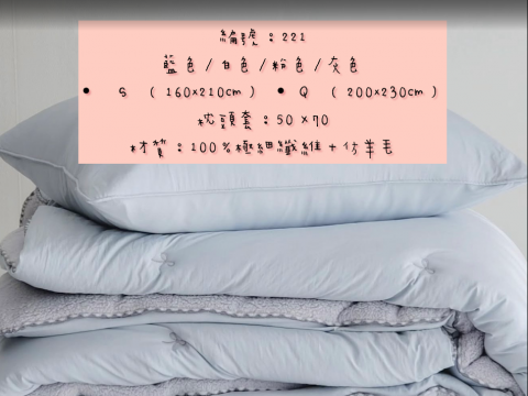 編號221 韓國棉被 顏色:藍/白/粉/灰色 尺寸S:160*210公分 Q:200*230公分 枕頭套50*70公分 材質:100%極細纖維+仿羊毛
