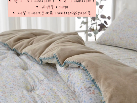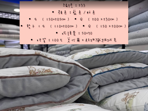 編號:233韓國棉被 顏色:藍/粉色 S:150*205公分 Q:200*230公分 墊子:S:110*200公分 Q:150*200公分 枕頭套:50*70公分 材質:100%莫代爾+超細纖維絨毛