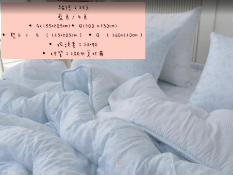 編號:243韓國被 顏色藍/白色 S:155*205公分 Q:200*230公分 墊子:S:115*205公分 Q:160*210公分 枕頭套50*70公分 材質:100%莫代爾