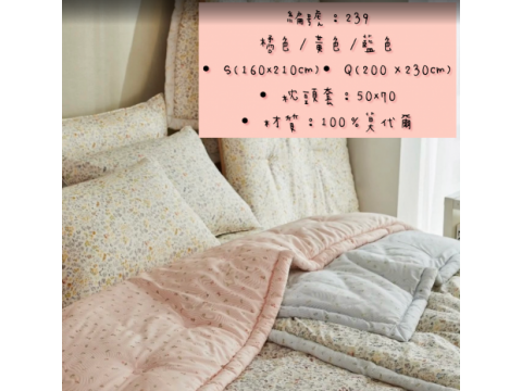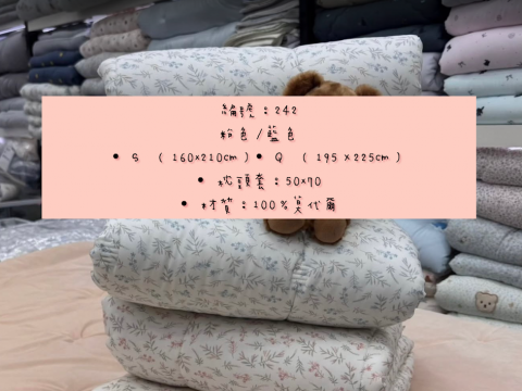 編號:244 韓國被 顏色:粉/藍/米色 尺寸:150*205公分 墊子:S110*205公分 枕頭套:50*70公分 材質:100%莫代爾